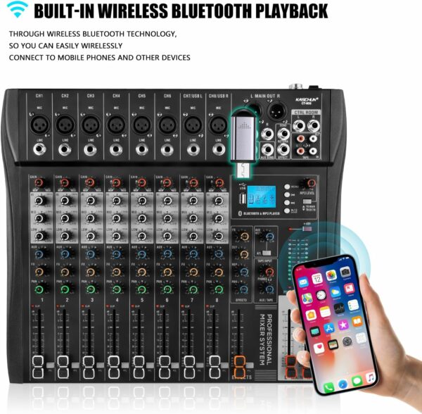 【Bluetooth Wireless Streaming】: The music mixer includes Bluetooth for wireless streaming, enabling it to be used as an input to mix signals with other input channels.The music mixer provides seamless Bluetooth for wireless streaming.8 -channel mixer supports cable/wireless/capacitive microphone/instrument connection, which is suitable for family KTV, band performances, campus activities, conferences and other occasions.Note: The wireless range is 15 ft.
