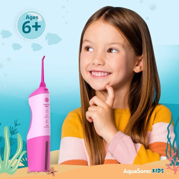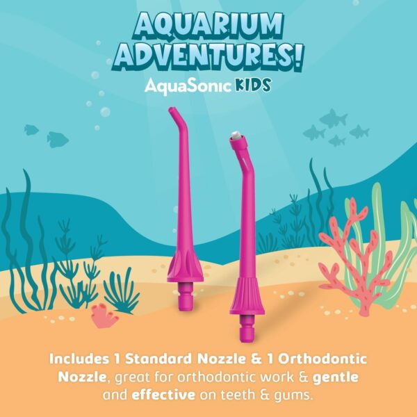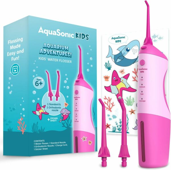 This fun and colorful set includes extra nozzles and waterproof stickers, for a completely cusomizable flosser. It is sure to make flossing fun and engaging for your child while giving you peace of mind of a complete clean. Give your child the gift of healthy teeth and gums with the AquaSonic Kids’ Water Flosser.