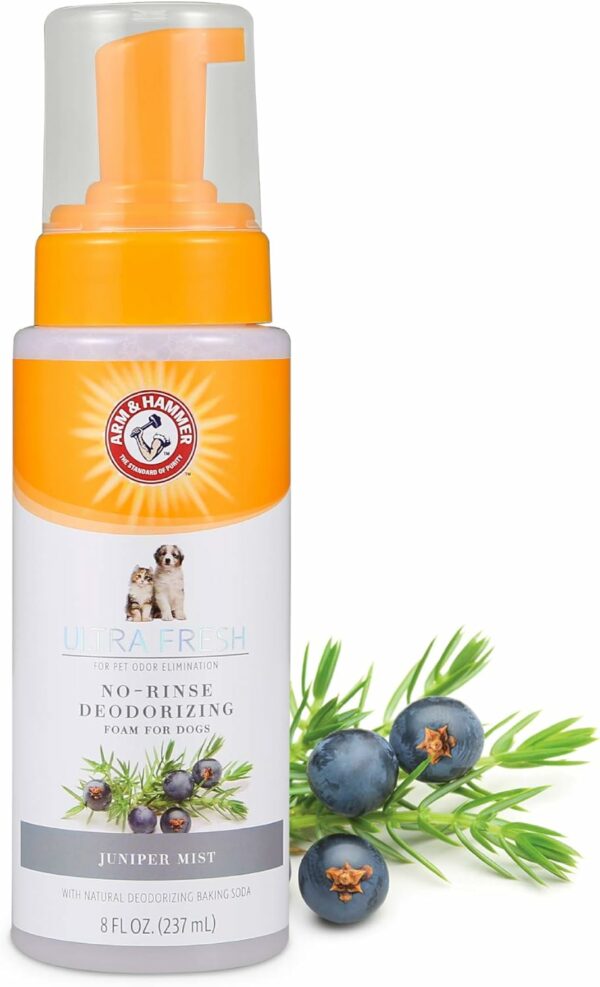 Freshen up your pet with Arm & Hammer Ultra Fresh grooming, the pet shampoo that takes cleaning to the next level. Our no-rinse deodorizing foam in a Juniper Mint Scent promotes soothing hydration and restores the coat’s vitality in between baths. This waterless shampoo for dogs is made with cactus water & citrus, and infused with baking soda to neutralize bad odors for an advanced clean. This dry shampoo foam makes clean-ups quick and easy with an uplifting juniper mist fragrance, leaving your pet Ultra Fresh every time. Bathing a pup can be challenging, but the Arm & Hammer Ultra Fresh dog bath is perfect for getting your dog clean without soaking them, while the juniper mist fragrance lasts all day. This waterless dog shampoo combats pet odors naturally with Arm and Hammer pet odor eliminator baking soda. It’s a quick, effective way to keep your dog looking and smelling fresh, from bath to walk. Whether you need a dog body wash or dog deodorant spray, this dog shampoo for smelly dogs is the ideal addition to your dog cleaning supplies.