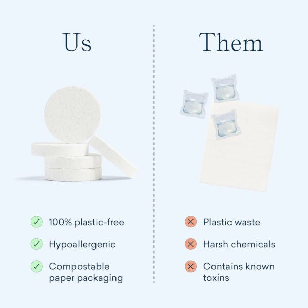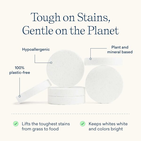PLASTIC-FREE, ECO-FRIENDLY LAUNDRY TABLETS. The first and only plastic-free Laundry Detergent Tablets that are tough on stains, but gentle on the planet. Our 100% plastic-free tablet is just as easy as any detergent pod, without any of the plastic film (PVA) found in most conventional pods.