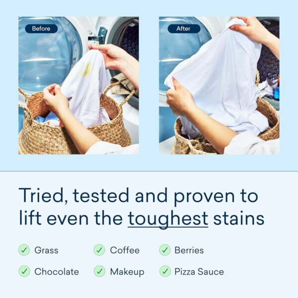EFFECTIVE. Patented detergent tablet powered by enzymes is proven to lift the toughest stains, from grass and coffee to food and makeup. Keeps whites white and colors bright.
