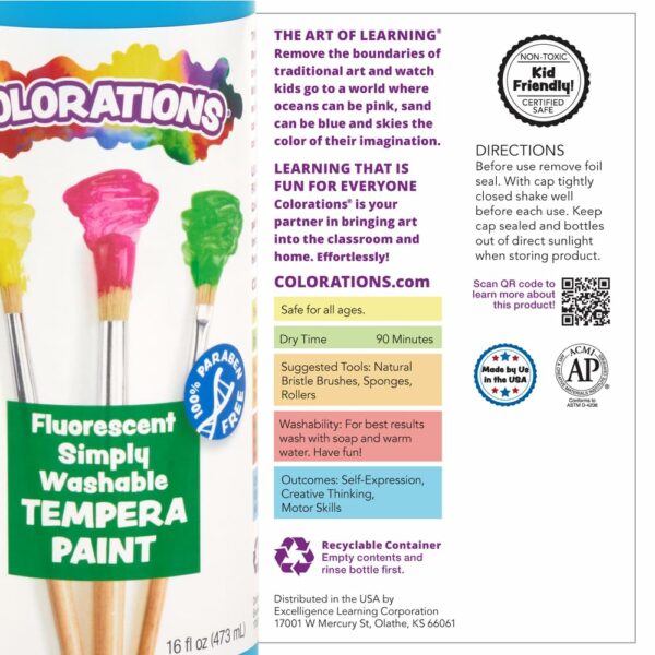 How brilliant! Neon paint that’s truly ultra-washable! Simply Washable Fluorescent Neon Tempera isn’t just the most washable tempera on the market, it’s also smooth and more opaque than competitors’ paint, at a fraction of the price. Simply Washable Fluorescent Neon Tempera lets you enjoy creamy, bold tempera color in 7 washable shades.