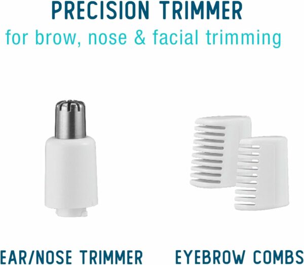 Precision Trimming for Smooth Results: Includes 1 precision trimmer for removal of peach fuzz, 2 comb attachments to shape and trim for gorgeous brows and rounded trimmer that fits just inside nose and ear canal for comfortable, effective cutting.