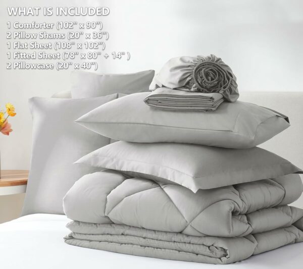 What You Can Get: King Size bed in a bag includes 1 Comforter 102″x90″, 2 Pillow Shams 20″x36″, 1 Flat Sheet 108″x102″ , 1 Fitted Sheet 78″x80″+14″ and 2 Pillowcase 20″x40″