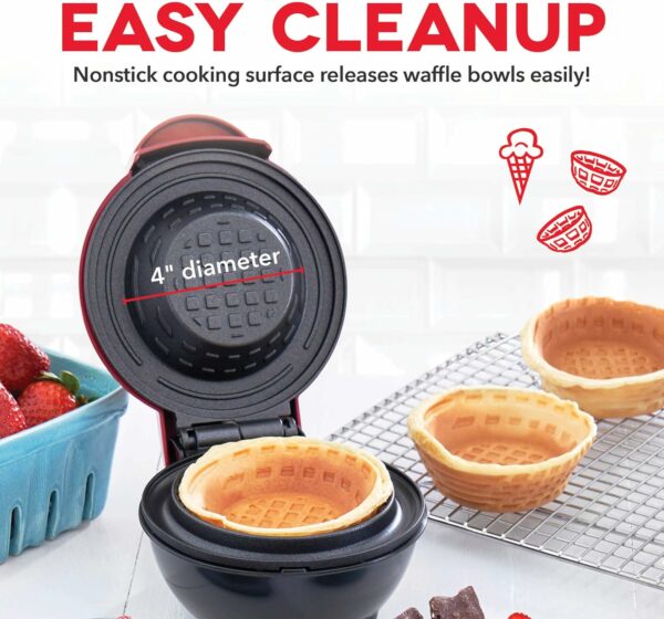 The Dash Mini Waffle Bowl Maker makes 4” bowl-shaped waffles for eye-catching desserts and breakfast creations. The dual nonstick surfaces heat evenly and release cleanly for perfect results, every time. The Mini Waffle Bowl Maker heats in just minutes, and one-step setup is easy and convenient. You can also use the Mini Waffle Bowl Maker to cook tortillas into single-serving taco bowls for perfect hors d’oeuvres and snacks! Use the included Recipe Guide for inspiration to take your waffles to the next level!