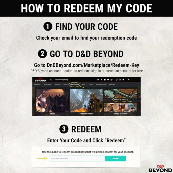 REDEEM YOUR CODE—Just copy the code sent via email and redeem it on the D&D Beyond website or forward the code to a loved one as a thoughtful gift (D&D Beyond account required to redeem. Physical book not included.)