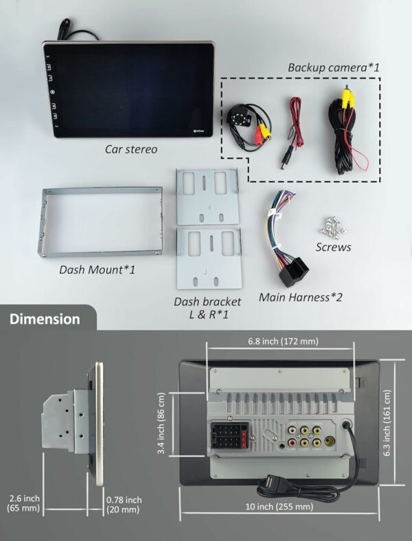 Operating System Linux Screen 10-inch LCD Touch Screen(5-point touch), Resolution 1024*600 USB Port 1*USB ports SD Card Slot DO NOT build-in SD card slot Side keys Backlight Color 7 backlight colors (Red, Fuchsin, Yellow, Green, Cyan, Blue, White) GPS module & GPS antenna DO NOT build-in GPS module and antenna RCA outputs 2 * L/R RCA output(It does not mean that only drives two speakers from the vehicle. It can be expanded 4 or more speakers outputs from amplifier) Video output 1 channel video ouput Internal microphone Build-in FM Range 87.5 MHZ~108 MHZ AM Range Not support A2DP Support Carplay/Android Auto Support both wireless and wired connection Mirror-Link Support both wireless and wired connection Package Included Car Stereo*1/Backup Camera*1/Main harness*1/Audio harness*1/Dash bracket*2/Dash mount*1/Screws/Instruction manual*1