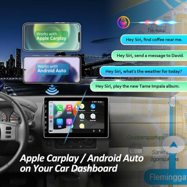 Are you getting hungry while you’re driving? Just ask your voice assistant to look for local restaurants that you can stop by along the way. This car stereo is compatible with wireless Apple CarPlay/Android Auto so you can quickly access all your iPhone or Android phone apps by Bluetooth connection through the 10-inch dashboard screen.