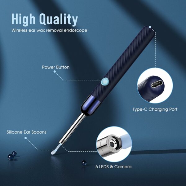 1080P HD Ear Camera: The earwax removal kit is equipped with 6 LED lights and a 1080P HD camera to help you see and clean earwax effectively. When in use, the earwax removal camera’s temperature is close to human body temperature. Suitable for adults, children, pets, check teeth, nose, throat, scalp root, and other body parts.