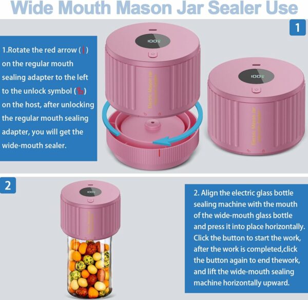 【Suitable for two types of Mason jars】The electric Mason jar vacuum sealer contains two sizes of mouth seals for your daily use. To get the standard mouth seal jar, simply insert the red arrow on the standard mouth seal converter, align it with the unlock symbol on the main unit and then insert it inside the silicone ring in the wide mouth seal area and tighten it clockwise, at this point the arrow is aligned with the lock symbol, which indicates a successful installation.