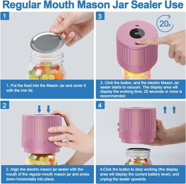 【Portable vacuum sealer】Don’t have a vacuum sealer? Don’t worry!!! We offer you an electric Mason jar sealer that you can use to extract the air from your Mason jars. The sealer is too big to carry with you when you travel or have a picnic? You can also use this electric sealer instead of it.