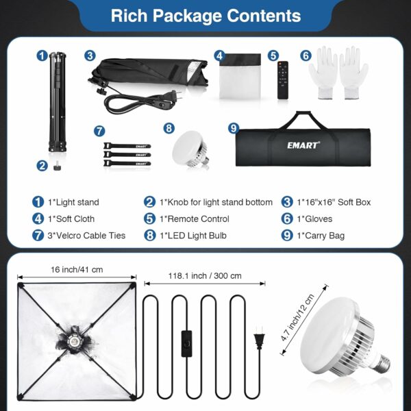 【Rich Package Contents】1 x 16″x 16″Soft box(Head 210° adjustable); 1 x 3000K-6000K 85W LED Bulb (with Remote Control); 1 x Gloves;1 x (18″to 65″/45cm-165cm) Height Adjustable Softbox Light Stand(with Nut for light stand bottom); 6 x Velcro Cable Ties ; 1 x Carry Bag. If you have any questions about our softbox lighting kit, please contact us, we will reply you within 24 hours