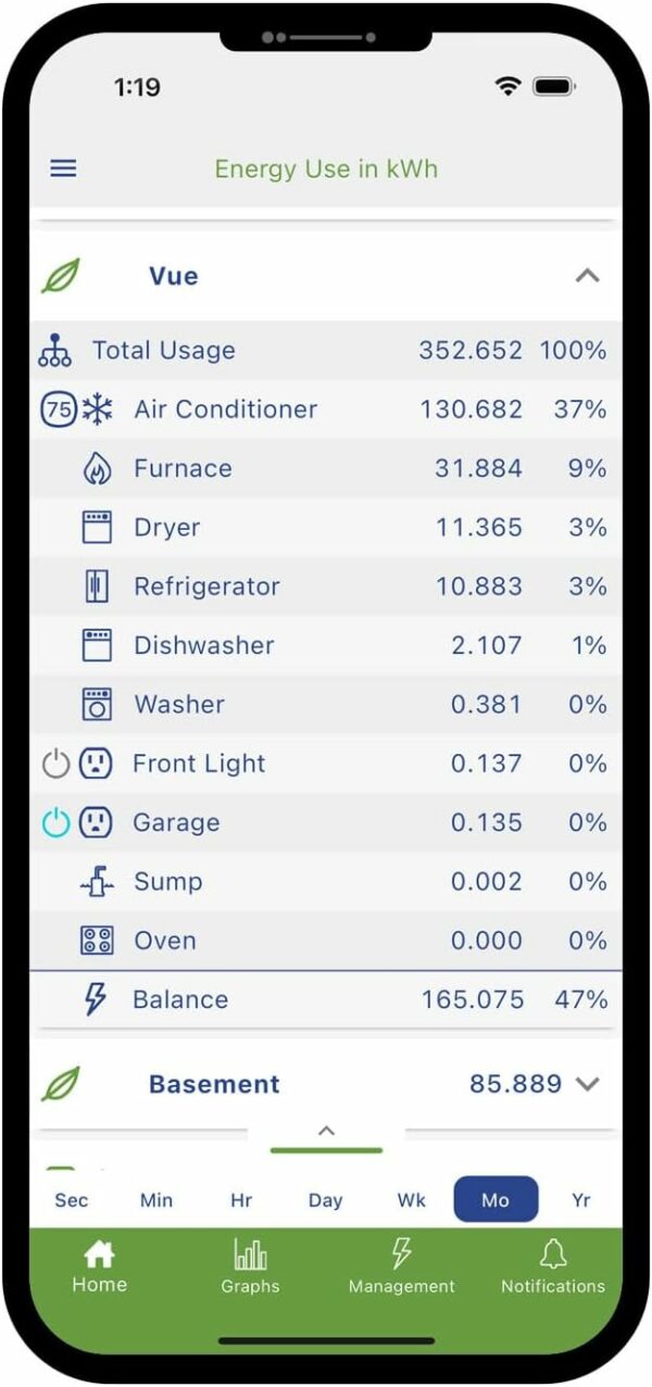 REAL-TIME ENERGY DATA: REQUIRES 2.4 GHz WIFI WITH AN INTERNET CONNECTION to monitor energy use with iPhone / Android / Web app. Vue sensors collect energy data and are accurate from ±2%. The Vue is UL and CE Listed for your safety. 1 second data is only available in the app (when actively open) and retained 3 hours. Minute and hour data are retained in the cloud. 1 minute data is retained 7 days, 1 hour data is retained indefinitely. Export cloud data whenever you want in the app.