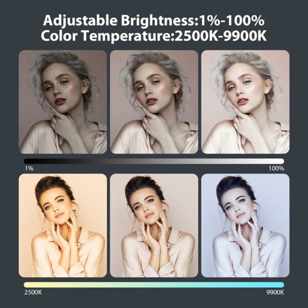 【Adjustable Color Temperature】Color temperature ranges from 2500K (warm) to 9900K (cool) (in 100K increments) to meet professional photo shooting needs. And the high definition OLED screen will show you the brightness, color temperature and battery status quite accurately