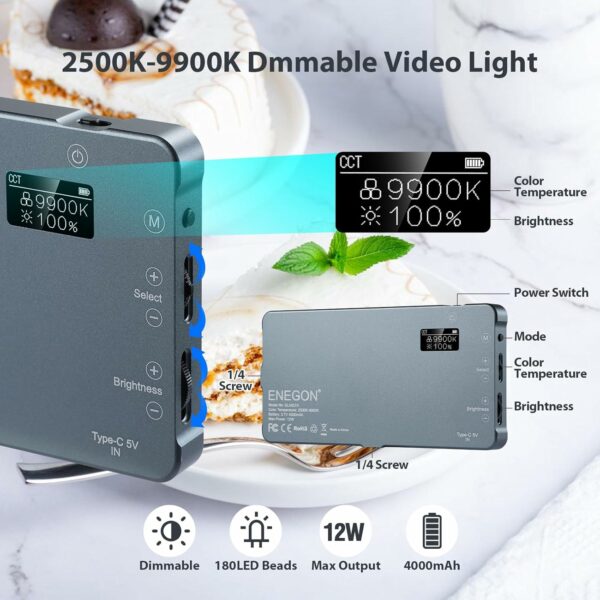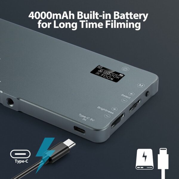 【Long lasting】With built-in 4000mAh rechargeable high-capacity lithium polymer battery, which allows a duration of 20 hours. It is more powerful than other batteries, allowing you to shoot outdoors and indoors for a long time. It has USB-C and Micro USB charging ports and the video light can be charged with a wall charger, power bank or car charger, etc. It is truly a must-have accessory for photographers and ideal for your travel vlogs