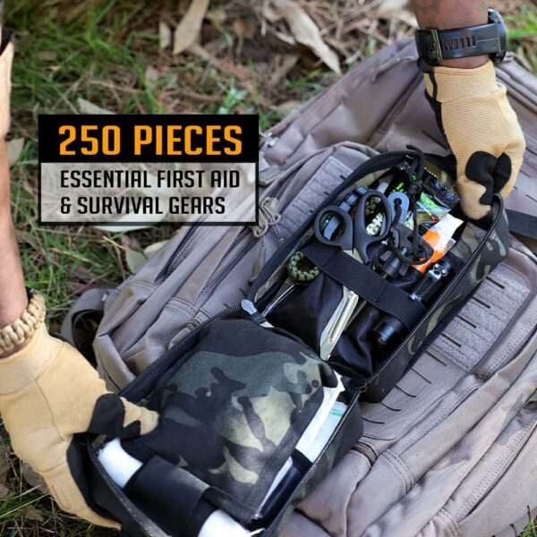 ✅【250 PCS First Aid Survival Kit, Meaningful and Cool Gifts Ideas for Families and Outdoorsman】Designed by army veterans and survivalists, the most compact and robust survival first aid kit contains essential first aid supplies and survival tools required for emergencies. Weighs only 2 Lbs, the kit is a must-have for your bug-out bag.