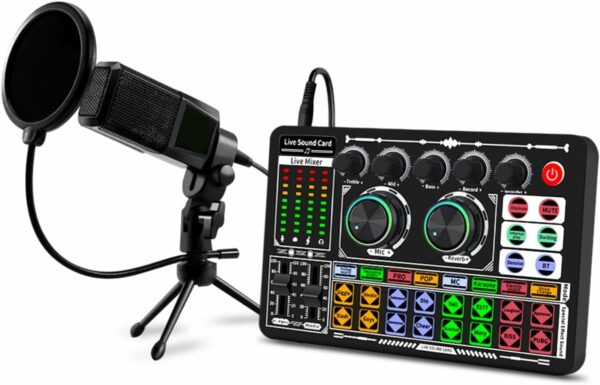 ❤️[What You Will Get]1* F999 Soundcard, 1* MS60 condenser mic, 1* xlr to 3.5mm microphone cable, 1* mic arm, 1* shock mount, 1* mic pop filter, 1* anti-wind foam cap, 1* USB to Type C charging cable, 2* 3.5mm TRRS audio cable,1* user manual, 1* instructions.