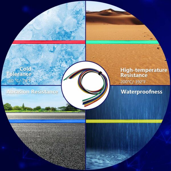 PACKAGE INCLUDED – Package Include: 14 gauge silicone stranded wire 10ft of each 6 different colors (black, red, blue, white, green, yellow, total 60ft), also packed both of φ6.5mm HEAT SHRINK TUBINGS (3pcs * 6colors= 18pcs total) & 4 inch WIRE TIES (3pcs * 6colors= 18pcs total)
