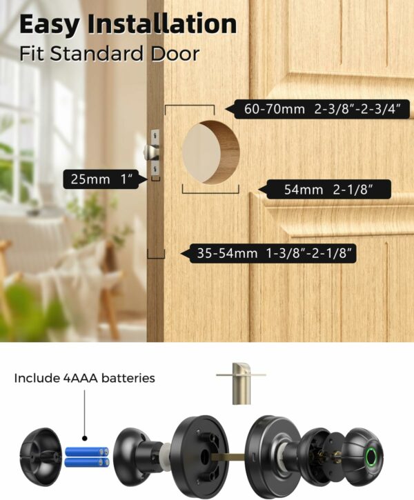 Auto Lock & Mute Mode: The biometric door knob with lock automatically within 5s, don’t have to worry about forgetting to lock the door. Activate Mute mode to silence lock sounds temporarily, Ensuring a peaceful atmosphere for your family, especially during late-night returns.