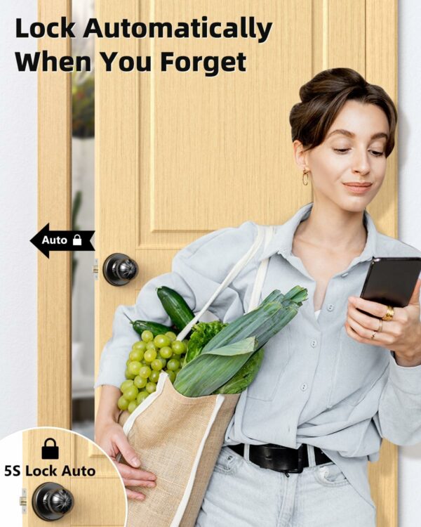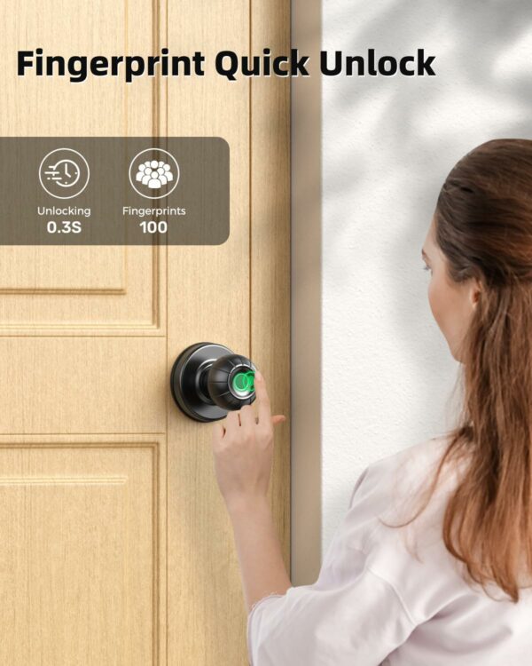 Fingerprint Quick Unlock : Smart door knob with the biometric feature allows for reaching your Unlock within 1s, And 5s Auto locking feature to ensure your home is safe. The biometric door knob is very easy to set up with your fingerprints and has memory capacity for up to 100 fingerprints, Easy access for the entire family , Mo longer needed to carry keys everywhere.