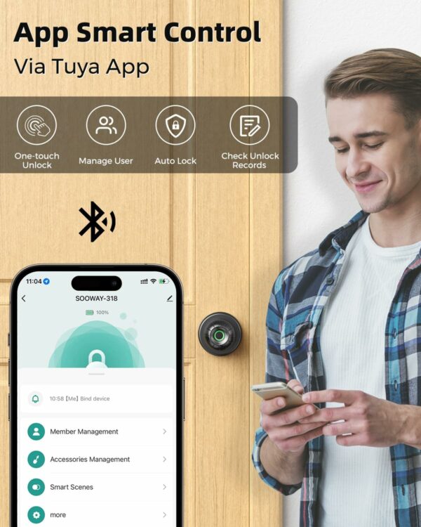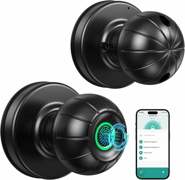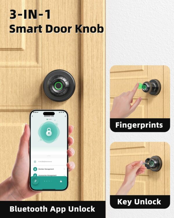 Bluetooth APP Smart Control: The fingerprint door knob support App control, which can easily get fingerprint manage. With bluetooth, you can unlock with your phone. You can check operate records, auto lock, Authorize admins, help you creat a smarter and much convenient life, keeps your home secure. *Control within Bluetooth Range.