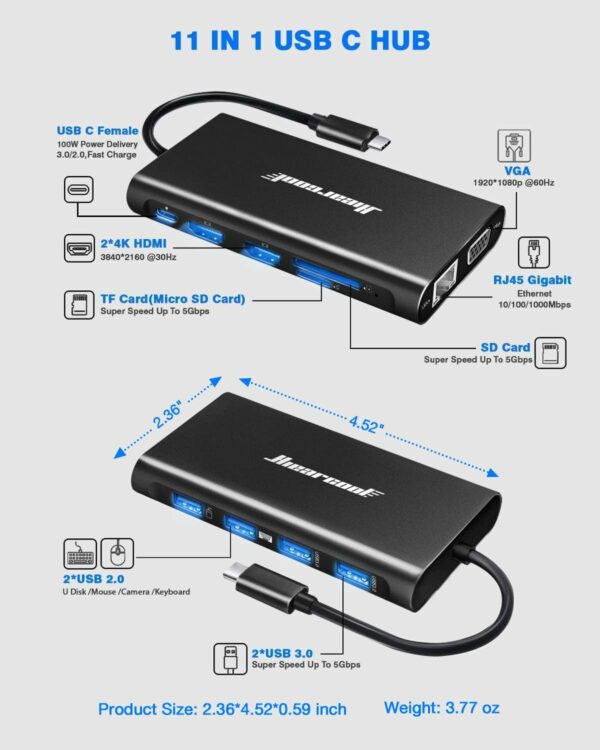 11 IN 1 Docking Station: PD charging port, Gigabit RJ45 port, 4K HDMI ports, VGA port,SD/TF card slot, USB 3.0 ports (up to 5Gbps), USB 2.0 ports backward compatibility