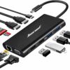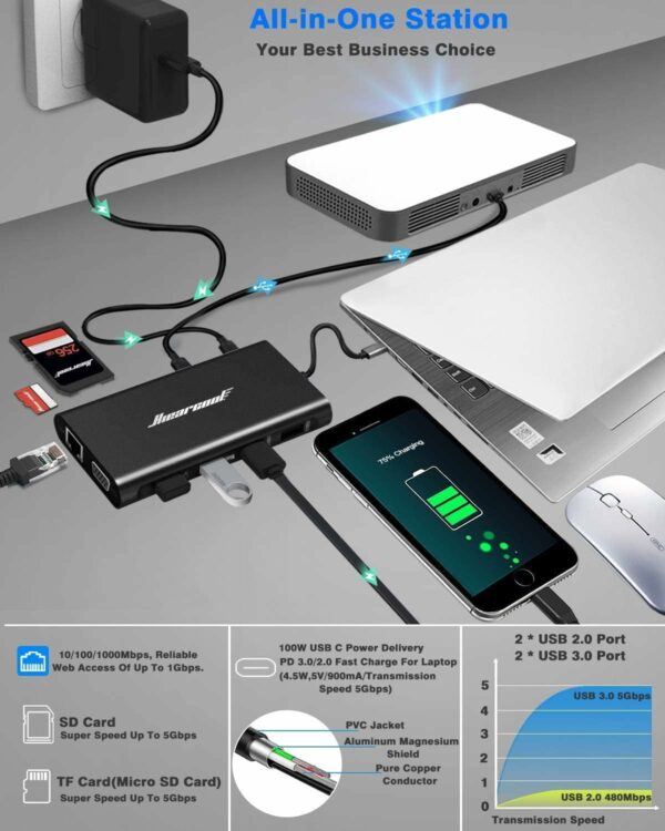 11 IN 1 USB C Docking Station: Supports 10/100/1000Mbps speeds. 1G movie in few minutes. With a rate of 5Gbps for USB 3.0 ports, SD and TF card slot included