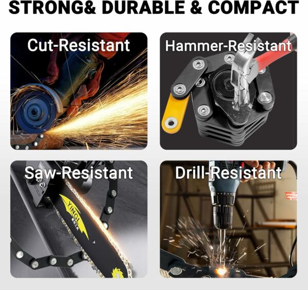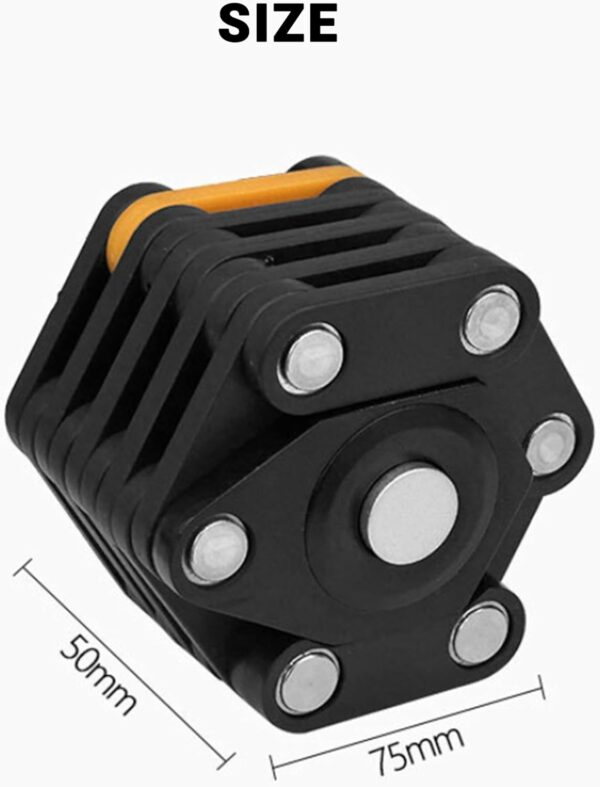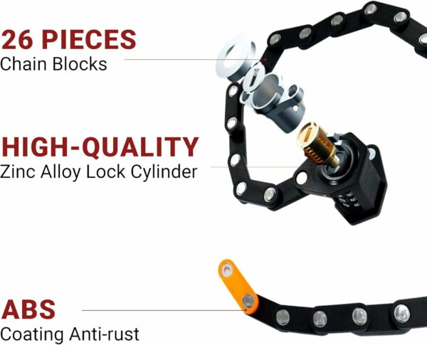 【Space-Saving and Foldable】 This bike lock effortlessly folds down into a compact size, ensuring exceptional portability and enabling convenient storage in your backpack or attachment to your bike frame. The flexible foldable bike lock extends to a chain link circumference of 78 cm.