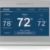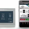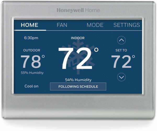 This second generation Wi-Fi smart color thermostat is ideally suited for the connected home. Its packed with smart features, a customizable color touch screen and a simple, DIY set up. You can control the thermostat using the touch screen and change the background color to match your paint color or personal preference or use your tablet or computer. All you need is a Wi-Fi connection, or use the free app for smartphone/Tablet to mange the thermostat remotely. Intelligent alerts help to keep your equipment running at peak performance by sending you air filter and humidifier pad Change reminders, and also to notify you of extreme high or low indoor temperatures and humidity. 1) View local weather – daily forecast on screen and 5 – Day forecasts on app, 2) fully flexible progamming options, 3) Auto change from heat to cool – automatically determines if your home needs heating or cooling to provide maximum comfort, 4) reliable, secure network ensures app availability, 5) permanent/temporary/vacation hold – adjust temperature to suit your schedule.Compatible with heating, cooling and heat pumps. Does not work with heat pumps with electric baseboard heat (120-240 volts)