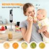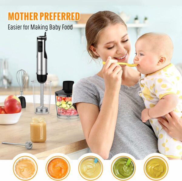 5-in-1 Multi-Purpose: Versatile handheld stick blender, 600ml mixing beaker, 500ml food chopper, egg whisk and milk frother meet your various needs for mixing, chopping, egg-beating, puree and preparing baby food. The 360° safety lock and one-click installation make removal and cleaning so easy.