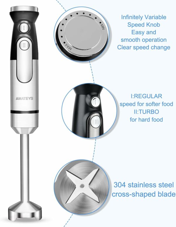 Continuously VariableTransmission: Amateys multi-function hand-held blender’s stepless speed change adjustment knob can accurately adjust the speed, and it can handle soft food and hard food sensitively with I-regular and II-turbine modes