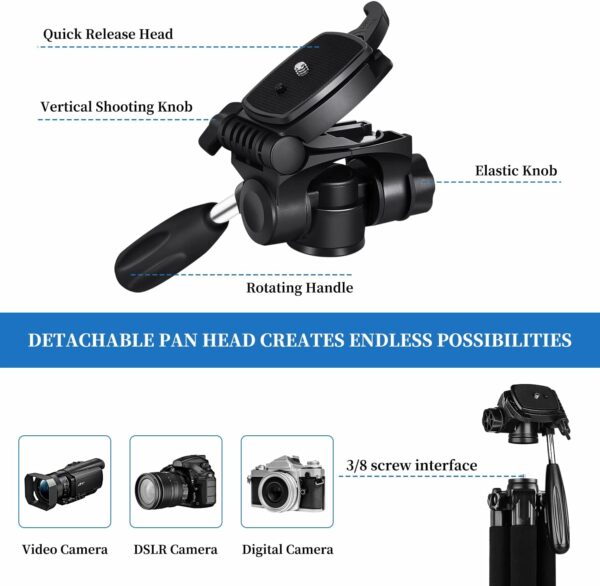 【Tripod for Camera and Phones】Quick-release plates and phone hodler maximize the compatibility to the greatest extent. Standard 1/4″ screw compatible with all cameras, DSLR, SLR, webcams, projector, ring light, spotting scopes, lasers, binoculars, etc