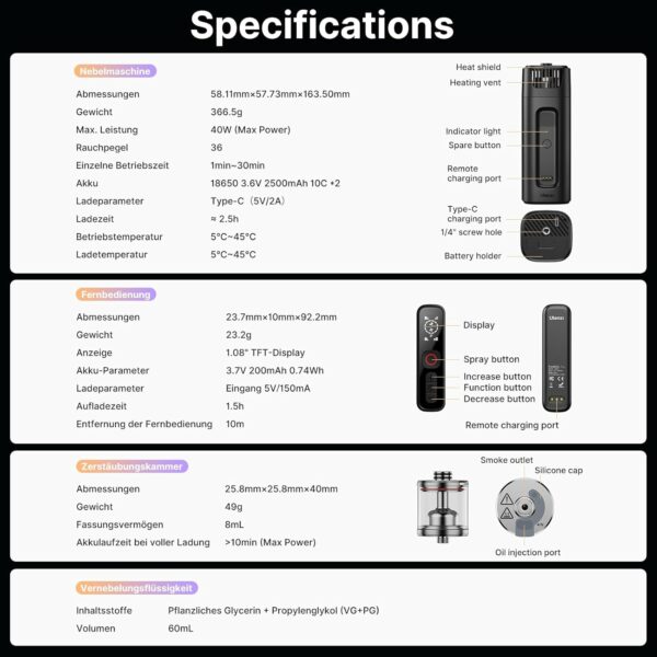 Worry-free Safety—Temperature control to prevent overheating/Heat shield/High-grade borosilicate tank; Vegetable glycerin/Foggy spray, no fine dust/Odor-free