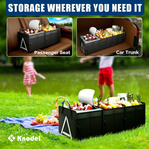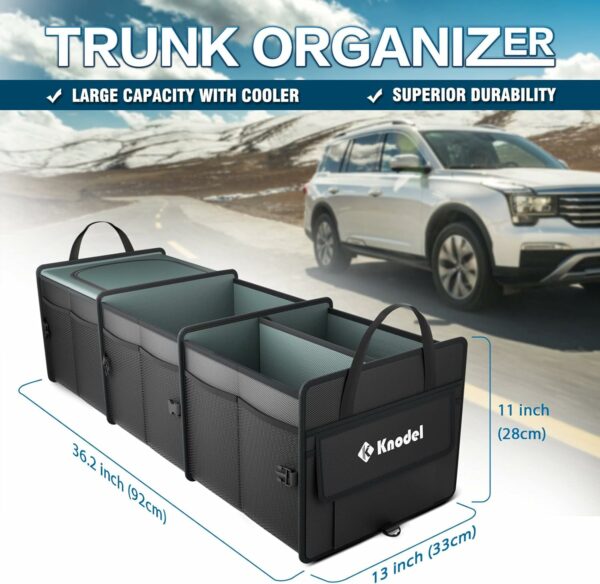 SUPERIOR DURABILITY AND WATERPROOF – The K KNODEL Trunk Organizer is made of high-quality 1680D Oxford Polyester material, which can withstand the weight of heavy items, and will last you through years of repeated use. Its dividers are made of 3mm card-board that is more firm and sturdy. Therefore, it is unlikely to bend or collapse when weight is added. In addition, the cooler bag is made of waterproof material, you can even put ice inside.