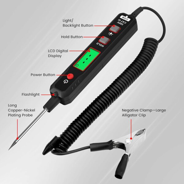 0.8-100 V Wider Testing Range : Upgraded technology allows for measuring a maximum voltage of 100 V, outperforming the majority of auto electrical testers available on the market. Widely and perfectly for examining different vehicles’ electrical circuits, such as automotive headlights, taillights, faulty sockets, and fuse connections, as well as other 0.8-100 V DC wirings and circuits