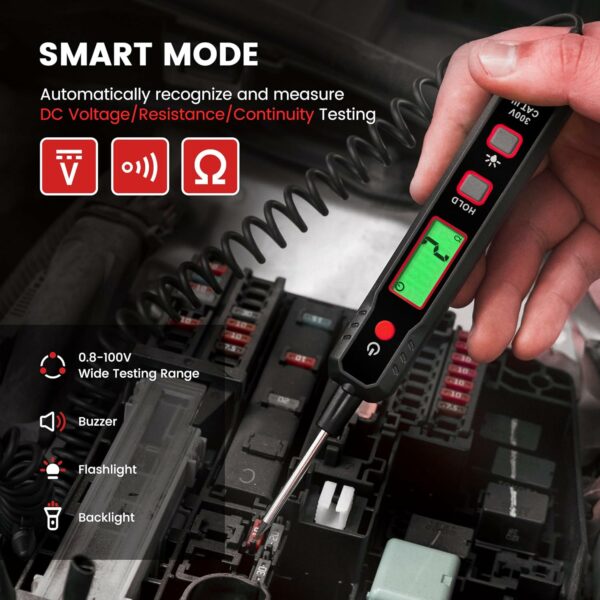 Smart Mode : The professional automotive circuit tester defaults to SMART mode. Automatically senses between DC voltage, continuity and resistance testing without having to change any settings for the highest precision, making it easy to use