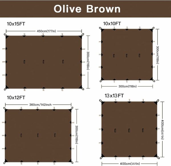 Our camping tarp is made of high quality 210T Polyester with strong PU 3000mm waterproof coating, weather-resistant, create dry hangout space for during a wet trip and provide a UV protection in the sun.
