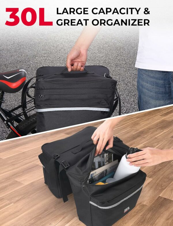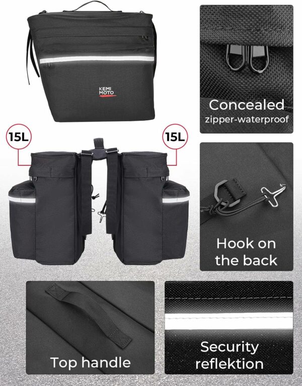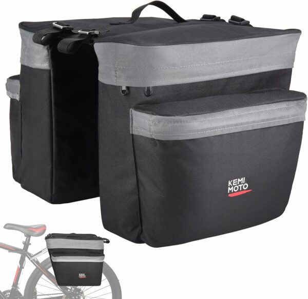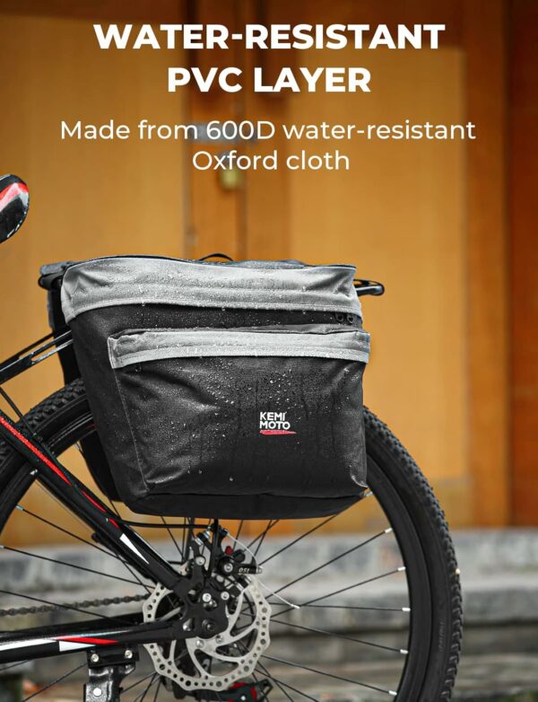 Large capacity – Kemimoto bike bag has a capacity of 17L per bag, and the total capacity of 2 bags is UP to 34L. Includes 2 main compartments for each bag. Plus the 2 pockets on the outside, ideal storage for daily essentials, biking gear, cycling accessories. It will be a good companion on the journey.