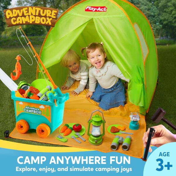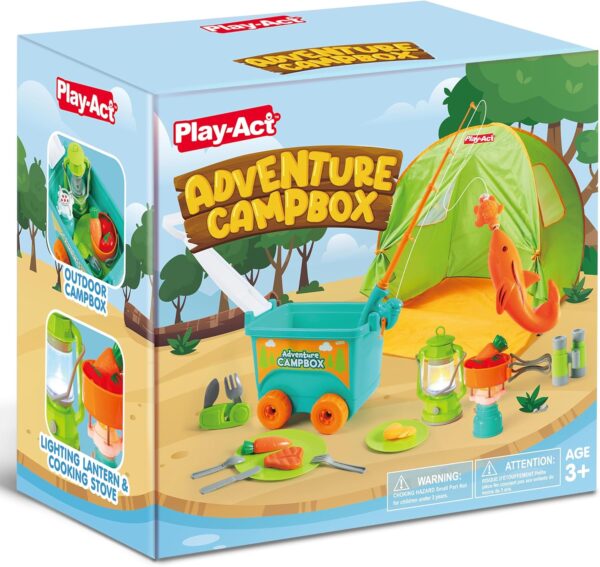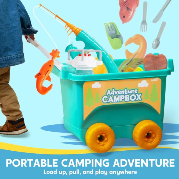Innovative Campbox Ease: True-to-life American camping scene design! The Campbox transforms from a storage bin to a pull-along cart, echoing true camper’s convenience. It’s a unique camping set for kids that also serves as a toy set for imaginative play.