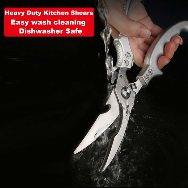 Heavy duty poultry shears Ergonomic handle design: Enlarged and elongated handle, easy to hold and use. Spring loading can reduce hand fatigue and make it more comfortable.The handle made of aluminum alloy, combined with anti slip texture, is more durable and wear-resistant.kitchen scissors heavy duty dishwasher safe.Heavy duty poultry shears that are more suitable for strong men with big hands.Silver Kitchen food scissors that are more suitable for women’s small hands.