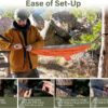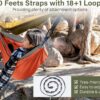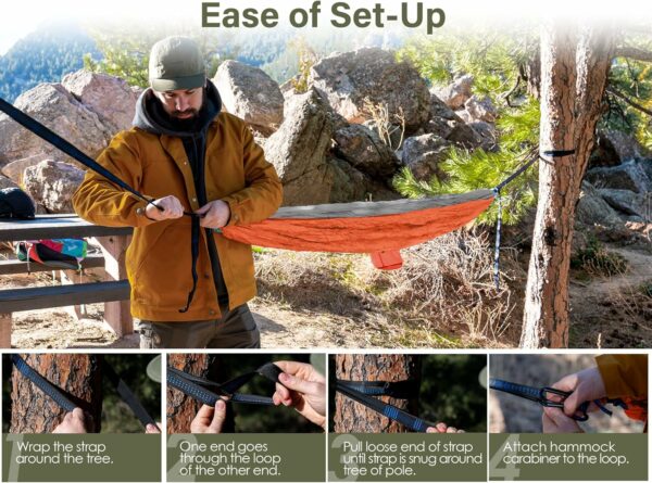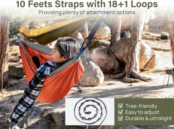 Easy Setup: Setting up your hammock has never been easier! Our hammocks come equipped with tree-friendly straps and carabiners, featuring 18+1 separate loops on each strap, allowing for easy and adjustable height and comfort—no need to struggle with knots, just clip on and adjust to your desired level of relaxation.
