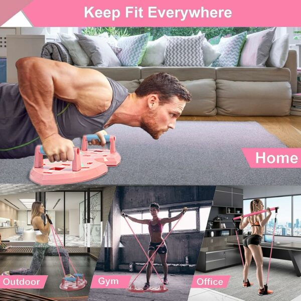 All In One Home Gym System:In addition to the push-up board, this all-in-one portable workout equipment system includes a Pilates bar and 20 fitness accessories. These fitness accessories, such as resistance bands and an ab roller wheel, provide a wide range of exercises to target various muscle groups for a complete full body workout.