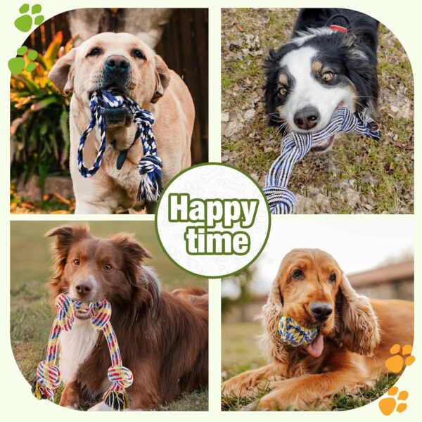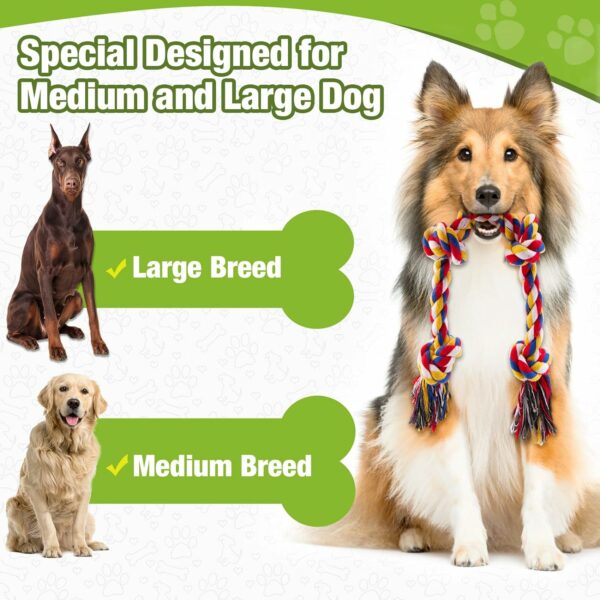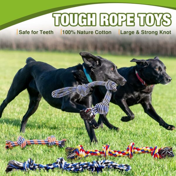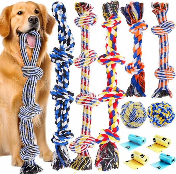 【SUPER VALUE DOG TOYS SET】Specifically designed for medium and large dogs, suitable for dogs 30-100 lbs, larger and thicker than other toys. Includes 4* 22.5″ heavy-duty knotted tug of war dog toys, 2 *11.5″ knotted dog chew toys, 2* 3.5″ rope balls toys and 4 *dog poop rolls. A wide variety of durable dog toys can not only meet your dog’s various daily needs, but also keep your dog’s mouth healthy!