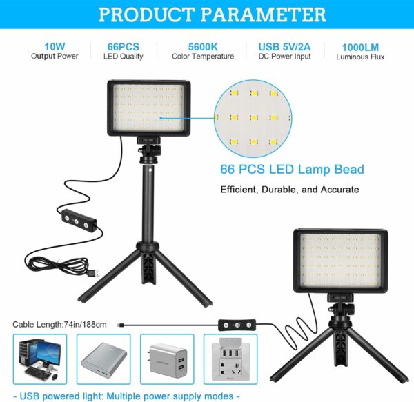 The light panel consists of 66 energy-saving LED lamps with adjustable brightness (10% to 100%) for excellent illumination. It doesn’t flicker even in low brightness.Note: Use the light with your own USB charger or a USB wall outlet that can output 5V 2A. For continuous use over a long period of time, it is not recommended to use it with a laptop, tablet or power bank in the case of rapid battery discharge and insufficient performance.Comes with 4 color filters (white, red, yellow and blue) to create different lighting effects.