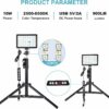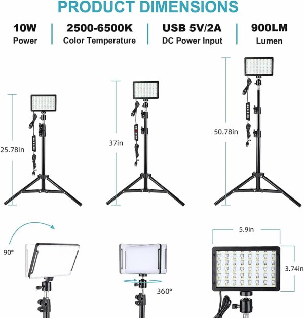 Extend Height: 25.78″-50.78″Light Panel Size : 5.9*3.74 in (15cm*9.5cm)Color temperature : 2500-6500 KLED Lifetime : 3000 HoursDimming : 10%-100%DC Power Input : USB 5V/2APower : 10WRA : ≥97Lumen : 900 LMLED Quantity: 136 pcs(Warm white 48pcs +White 48pcs +RGB 40pcs)Light Effect Mode : Warm white,white,RGB 7 Color and 5 scenes light effects(Candlelight, Police Car, Lightning, Fireworks, RGB Cyclic Strobe)