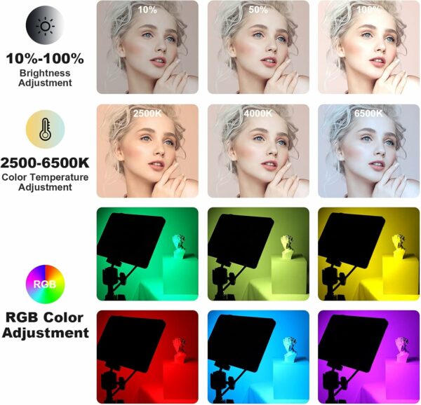 【7 Color Temperatures &Creative RGB Video Lighting】: Basic lighting modes of RGB indoor photography lights are warm white light, cool white light and RGB 7 colors. Can do creative effects like simulating the backdrop lighting from an ambulance or police car or the strobe lighting from a bonfire or fireplace.