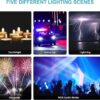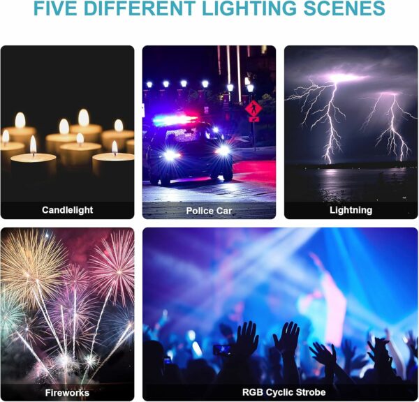 Warm white light and cool white light.7 RGB lighting modes: Red, Orange, Yellow, Green, Cyan, Blue, Purple.Special 5 scenes lighting modes: Candlelight, Police car, Lightning, Fireworks, RGB cyclic strobe