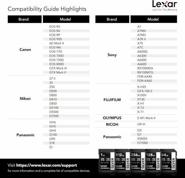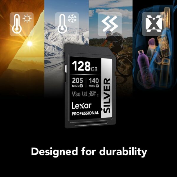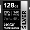 The Lexar Professional SILVER SDXC UHS-I Card delivers 205MB/s max read and 140MB/s max write speeds to help you capture better photos and videos and to accelerate your workflow. Rated V30, it records 4K video at 60FPS for stunning, stutter-free footage. It’s temperature-, x-ray-, vibration-, magnetic-, shock-, wear-, and drop-proof and it comes with a lifetime limited warranty for maximum peace of mind.