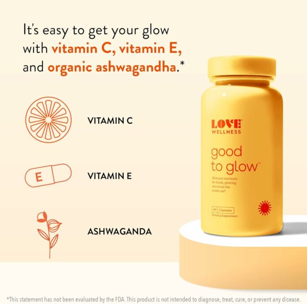 BRIGHTEN SKIN TEXTURE*: Perfect for aging skin, Love Wellness Good to Glow is made with Biotin and Ashwagndha. These ingredients help reduce the appearance of fine lines and wrinkles while brightening and firming your complexion.* Serving size 2 capsules, 30 servings per bottle.