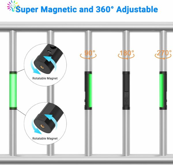 👍【Magnetic Adsorption Design】2 magnets and dual standard ¼” nut are placed on both ends, you can use by handheld, attach it on a tripod (light stand and camera etc.) or any metal surface for use. When the magnets are adsorbed, you also can rotate the lamp body (360°) to adjust the angle